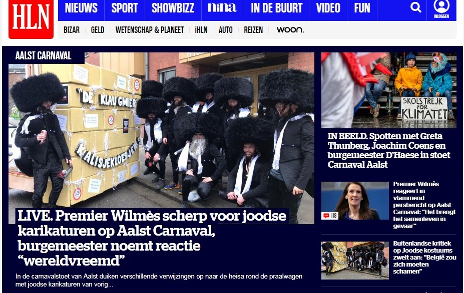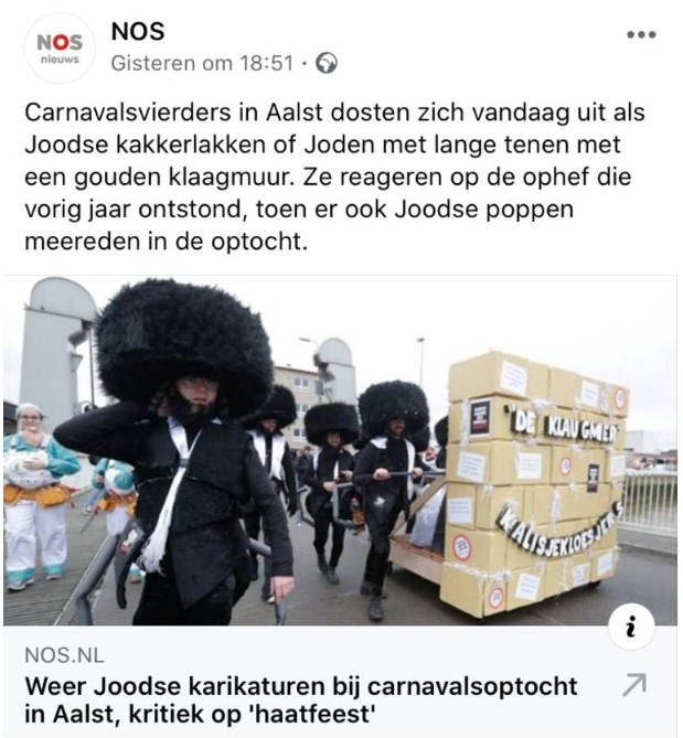 Maar nu is dat al twee jaar na mekaar gelukt, al is het dan tamelijk negatief, want twee keer ging het over antisemitisme. Onze stad is nogal bekend voor zijn carnavalgebeuren en in de stoet die gevormd wordt door bijna 200 verschillende carnavalsgroepen waren er in 2019 karikaturen van traditionele joden te zien. De verontwaardiging daarover ging zover dat er serieus gelobbyd werd om de erkenning van Aalst-Carnaval als Unesco-werelderfgoed te schrappen. Zover kwam het niet omdat de burgemeester zelf die waardeloze erkenning in de vuilbak gooide. Het was natuurlijk te verwachten dat de joden er het jaar daarop ook weer gingen van langs krijgen en zo was er dan een groep te zien, verkleed als joden die een kartonnen klaagmuur voortduwden. Omdat in ons dialect ‘muur’ uitgesproken wordt als ‘mier’, maakten die mannen gebruik van deze woordspeling door een soort mierenpoten aan hun kostuum te hangen.