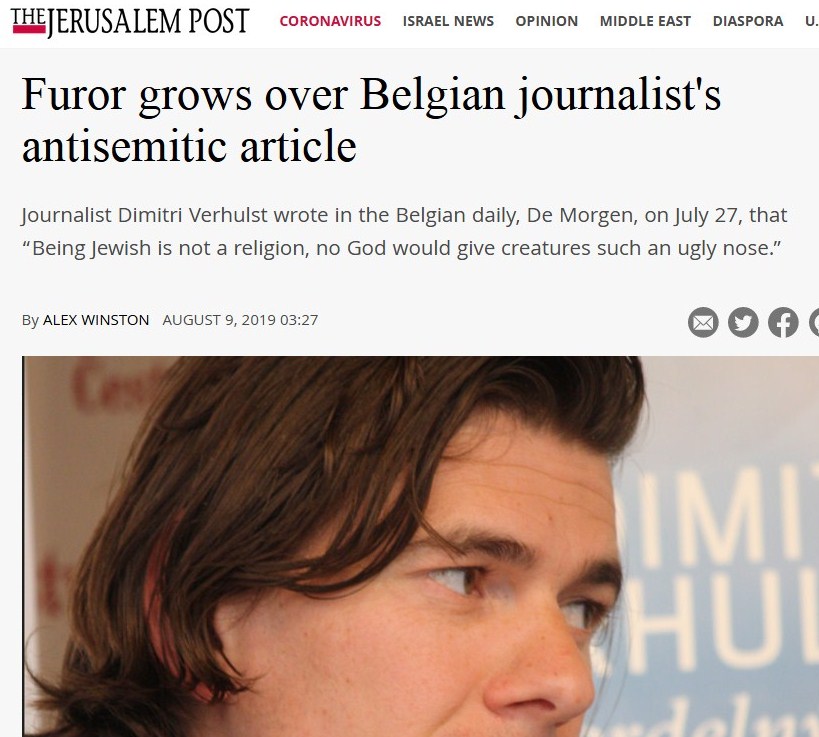 Een andere antisemitische misdaad werd ook in 2019 gepleegd, ook maar eens door een Aalstenaar, Dimitri Verhulst. Dat schijnt nogal een populaire schrijver te zijn, hij krijgt in de links-progressieve pers altijd veel plaats om zijn standpunten te ventileren. In De Morgen zegt hij dat joods zijn geen religie is, dat geen enkele God aan zijn schepsels zo’n lelijke neus zou geven.