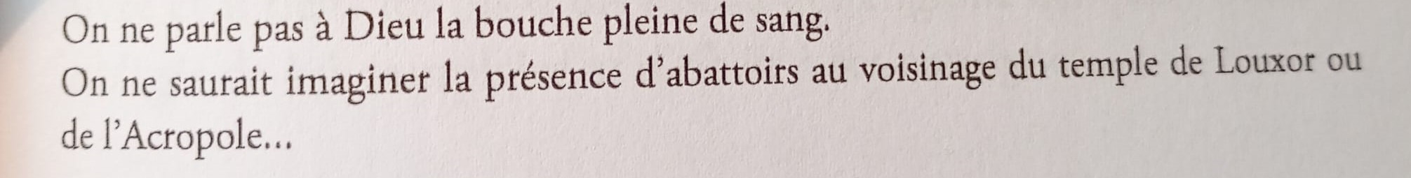 “Men kan zich niet tot God richten met de mond vol bloed ! Het is ondenkbaar dat er slachthuizen zouden geweest zijn in de buurt van de tempel in Luxor of op de Acropolis.”