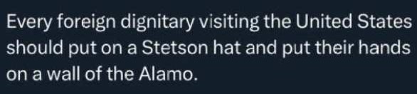 Iedere buitenlandse staatsman die de Verenigde Staten bezoekt zou moeten een Stetson opzetten en zijn hand leggen op een muur van de Alamo (De Alamo was een katholiek missiegebouw in San Antonio waar de Texanen in 1836 tot de laatste man vochten voor hun onafhankelijkheid).