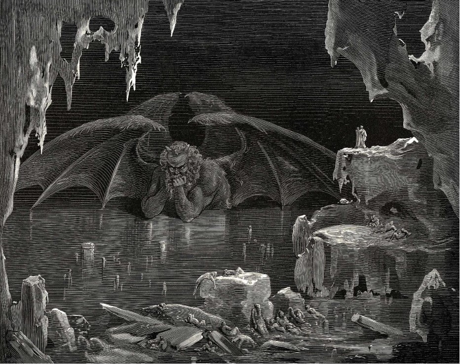De duivel, vastgevroren in het ijs in het centrum van de Aarde, zoals Gustave Doré hem toonde in zijn illustraties bij Dante’s Goddelijke Komedie.