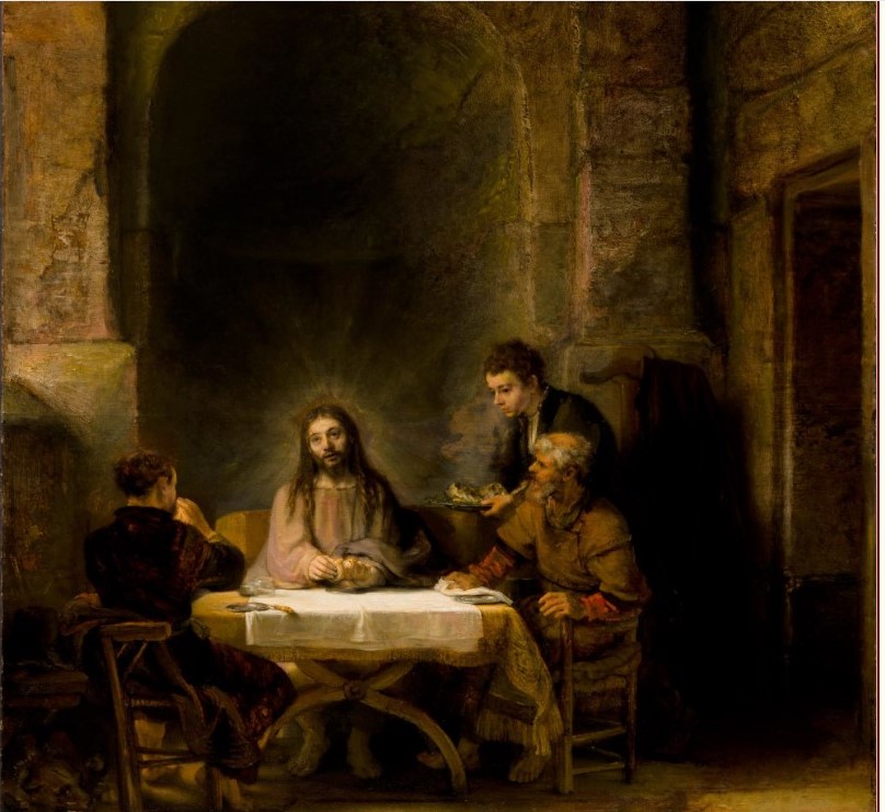 Rembrandt heeft zich bijna 20 jaar met de scène in Emmaüs bezig gehouden. De eerste schetsen van rond 1630 zijn nog sterk gekenmerkt door een uiterlijke dramatiek. Het schilderij dat nu in het Louvre hangt toont een grote rust en gevatheid van de hele scène. Een wonderlijk licht weeft in de ruimte. De twee volgelingen worden uiterlijk rustig weergegeven, elk helemaal op zichzelf, en de Christus verschijnt alsof Hij het volgende ogenblik weer uit het schilderij zou kunnen verdwijnen. In deze versie wordt het de beschouwer mogelijk gemaakt om zich in te leven in de stemming die beide volgelingen op het ogenblik van het besef ervaren. Toen het brood gebroken werd en hun letterlijk en figuurlijk een licht opging.