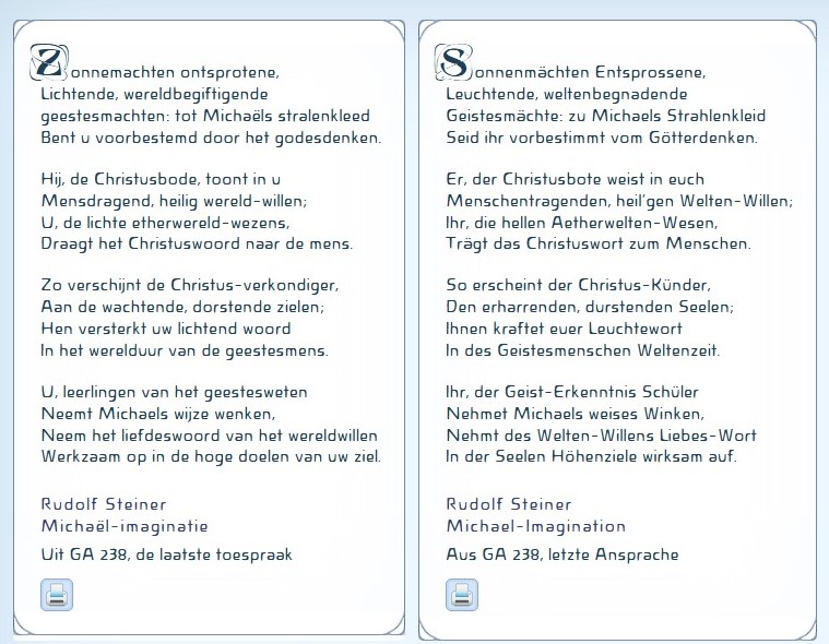 17) Michaël heeft door de chaos een bepaalde speelruimte gegeven binnen de kosmische orde, dat wil zeggen een ruimte voor spel. Nu heeft Schiller in zijn Esthetische Brieven de speel-tendens gekarakteriseerd als de drager van het eigenlijk-menselijke in ons, de bemiddelaar tussen de Vorm-tendens en de Stof-tendens. Hij zag in het spel van het kind de oer-manifestatie van de mens als vrij wezen. 18) We proberen te begrijpen wat er gebeurt als een kind met iets speelt. Het kind komt uit de geestelijke wereld; het is neergedaald uit de hoogste regionen van de sferen-muziek, uit het gebied van de klinkende, sprekende kosmische orde. Dat draagt de kinderziel als naklank in zich. Als het geboren is komt het via de zintuigen in contact met de fysieke wereld. Daar is alles voor hem een grote chaos. En al wat het kind leert in de loop van de tijd, dat bestaat erin om orde in deze chaos te brengen. 19) Een deel van dit ordenen is heel eenvoudig dat wat het kind van zijn ouders, van zijn omgeving opneemt. Een grote hoeveelheid weten en kunnen moet het kind zich eigen maken, zaken die het alleen op aarde kan leren. Maar de naklank van de kosmische orde, die klinkt door in het aardeleven als het kind speelt, dat wil zeggen, wanneer het innerlijk leven, de ziel van het kind bepaalt wat het met een bepaald voorwerp of speeltuig gaat doen. 20) Wij volwassenen maken een groot onderscheid tussen dingen die wij au serieux nemen en andere dingen die slechts een spel zijn. Voor een kind bestaat dit onderscheid niet. Het neemt zijn spel zeer ernstig op. Vooral als een kind alleen met iets speelt kan men zien hoe ernstig het bezig is met zijn spel. 21) Voor de volwassenen is er maar één mogelijkheid om zoals het kind iets ernstig te nemen wat toch slechts een spel is : dat is als kunstenaar. Poëzie is een spelen met woorden, muziek een spelen met klanken, schilderen een spel met kleuren. De kleinburger gaat deze bezigheid nooit echt serieus nemen, zo serieus als een financiële transactie of een grote reis. De kunstenaar echter is een kind gebleven en neemt zijn spelen met kleuren of klanken zo serieus dat hij daar in feite niet kan over praten met mensen die deze dingen niet serieus nemen. 22) De kunstenaar en het kind nemen hun spel ernstig – en ze zijn ook ernstig wanneer ze spelen. Wie een spelend kind observeert die kan zien hoe ernstig dat kind in zijn spel leeft, niet minder dan de dichter of schilder bij hun werk of de euritmist die een nieuw stuk instudeert. En de reden is in al deze zaken dezelfde : het kind en de kunstenaar vergeten zichzelf. 23) Maar dat is ook de ernst van Michaël waarover Rudolf Steiner in deze brief spreekt. We proberen nu te verstaan wat met de ernst van Michaël bedoeld wordt. Dan moeten we ons eerst bezinnen over een bepaalde eigenschap van het fysieke licht. Dat is iets waar iedere leraar op wijst als hij bij het hoofdstuk optica komt. Maar deze eigenschap van het licht wordt vaak niet volledig begrepen, namelijk het feit dat het licht zelf onzichtbaar is. Pas als het op een voorwerp valt en het voor ons zichtbaar maakt, weten we dat het licht is. 24) Het licht zelf kan men niet zien, het is niet zichtbaar. Men kan dit gegeven nog anders uitdrukken, men kan zeggen : het licht belicht en verlicht alles in de wereld …. Maar niet zichzelf. Of men kan zeggen : het licht geeft zichzelf volledig aan de wereld, het behoudt niets voor zichzelf. Het licht is volkomen onzelfzuchtig – en daarop is ook het woord van Christus gebaseerd : Ik ben het Licht der wereld. 25) Het fysieke licht vergeet zichzelf volledig en geeft zich aan de wereld. Maar dit fysieke licht is slechts de uiterlijke afdruk, de uiterlijke omhulling van het kosmische licht, van de kosmische intelligentie. En de kosmische intelligentie, die is volgens haar eigenlijke wezen onzelfzuchtig – geeft zich volledig aan de wereld. En nu zegt Rudolf Steiner in deze zevende brief dat de bewaarder en hoeder van de kosmische intelligentie volledig onzelfzuchtig zichzelf geeft aan de wereld en dat komt tot uitdrukking in zijn ernstige blik. Zichzelf geven aan de wereld zoals het hier bedoeld wordt, wil zeggen verantwoordelijkheid dragen voor de wereld, en dat is wat Michaëls blik zegt. 26) Verantwoordelijkheid voor het juiste verloop van de wereldontwikkeling en mensheidsontwikkeling, die lag in de oertijden bij de goden. Later konden grote mensheidsleiders, de zogenaamde grote ingewijden, die verantwoordelijkheid delen met de goden. We gaan echter een toekomst tegemoet waar altijd meer mensen-individualiteiten – in vrijheid – bewust mede-verantwoordelijk moeten worden. Daarmee moet in onze tijd een begin worden gemaakt en de hele antroposofie is een oproep tot verantwoordelijkheid. 27) Altijd en voor alle tijden is Michaël met deze wereldverantwoordelijkheid verbonden, dat zegt zijn ernstige, manende blik. Wij antroposofen kennen deze blik maar al te goed : hij kijkt ons aan vanop iedere foto van Rudolf Steiner. De blik die wij in Rudolf Steiners ogen zien is de fysieke uitdrukking van de Michaël-ernst in de geestelijke wereld. 28) Dat heeft ook betekenis voor de toekomst. In de voordracht over het karma van de Antroposofische Vereniging zegt Rudolf Steiner dat de ware antroposofen in hun volgende incarnatie bepaalde gelijke trekken zullen vertonen in hun gelaatsuitdrukking, die volledig los zal staan van de algemene volkskenmerken. Wat ook gemakkelijk in te zien is want voor echte antroposofen zal Michaël altijd meer de plaats innemen van de oude, aan de erfelijkheid gebonden volksgeesten. Michaël is de groepsgeest, de gemeenschapsgeest van de antroposofie.
