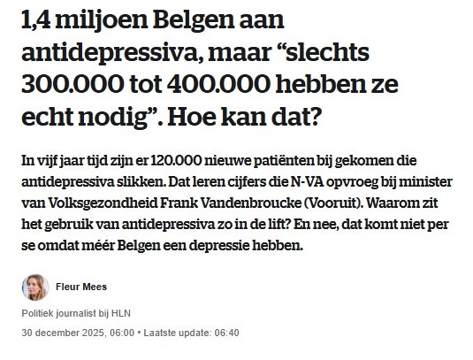 * Volgens La Dernière Heure van 3 augustus 2003 is de verkoop van antidepressiva in de V.S. van 1999 tot 2002 gestegen met 36 %, in Spanje met 48 %, in Italië met 57 %, in België met 28%. Gemiddeld heeft elke Belg vorig jaar 23 doosjes geslikt. (Bron: Journaal nr. 401 van Mark Grammens)