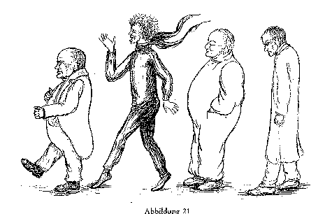 1. het fysieke : het verband met het element "aarde" is duidelijk ; Ik moet er de nadruk op leggen dat er geen morele waardebepaling kan gegeven worden aan de verschillende temperamententypes op zichzelf : het ene is niet beter of niet slechter dan het andere. De manier waarop wij omgaan met ons temperament is wél van belang, want door ons temperament binnen de juiste banen te leiden kunnen wij onszelf veredelen; in het andere geval kan het tot ongecontroleerde uitspattingen leiden. Ieder mens heeft de vier temperamenten in zich, maar niet in dezelfde verhouding. Eén type treedt altijd krachtiger naar voren dan de drie andere. Welk type domineert hangt af van de mate waarin het geestelijke meer of minder weerstand ondervindt wanneer het zich verbindt met het fysieke. Wanneer het "Ik" op een grote weerstand stuit vanwege de erfelijke substantie, kan het fysieke lichaam moeilijk doordrongen worden. Het "Ik" heeft er geen vat op. Daarom voelt de melancholicus zijn lichaam aan als te zwaar en te lastig en gaat hij gebukt onder een verborgen innerlijke smart. Door deze last kan hij moeilijk belangstelling hebben voor de buitenwereld en blijft hij in zichzelf gekeerd ( figuur 4 ). Het "Ik" van de flegmaticus kan het vaste stoffelijke wel beheersen, maar het blijft steken in dat andere element, het vloeistofachtige. Dit waterachtige heeft in feite een grote hekel aan al het vaste en streeft ernaar om alles in zijn eigen element te handhaven. Vandaar dat de flegmaticus belust is op eten en drinken; hij wil a.h.w. blijven drijven in zijn eigen stofwisseling en daarbij ondervindt hij een groot welbehagen. Omdat hij daarmee zo intensief bezig is, heeft hij weinig belangstelling voor de buitenwereld ( figuur 3 ). In figuur 2 zien we de sanguïnicus in actie. Niets dat zwaar of lastig is kan men hier bespeuren, en het lijkt wel of het lichaam telkens opnieuw vanaf de bodem wil opzweven. Dit type gaat volledig op in het lucht-achtige. De sanguïnicus voelt zijn lichaam niet, zijn gewaarwordingen in en buiten hem voelt hij des te meer. Talloze gevoelens en gedachten komen in hem op, maar hij wil of kan er niet blijven bij stilstaan, want spoedig lossen ze zich weer op in het niets. Laten we tenslotte figuur 1 eens bekijken. Het is duidelijk dat we hier met een zeer vurig kereltje te maken hebben. Het "Ik" gaat resoluut zijn eigen gang en duldt van niets of niemand tegenspraak; het lichaam moet noodgedwongen volgen. Waar het sanguïnisch type in de buitenwereld leeft maar zonder er zich echt mee te verbinden, grijpt de cholericus actief in de buitenwereld in en wil er werkelijk zijn wil aan opdringen. Men mag nietvergeten dat het temperament slechts als bemiddelaar optreedt tussen het fysieke en het geestelijke in de mens. Indien men steeds willoos de impulsen van zijn temperament volgt, dan verliest men er de controle over en begint het een eigen leven te leiden. Het cholerisch temperament uit zich dan in een ontspoord driftleven, het sanguïnische in oppervlakkige en absurde handelingen en gedachten; het flegmatische neigt naar stompzinnigheid omdat het zich slechts voor zijn eigen spijsverteringsprocessen interesseert en het melancholische type, dat voortdurend onder smarten gebukt gaat, wordt depressief. Als we nu nog eens de vier figuren bekijken, dan kunnen we mits een beetje fantasie inzien dat de temperamenten in extreme gevallen kunnen leiden tot de volgende vormen van krankzinnigheid :