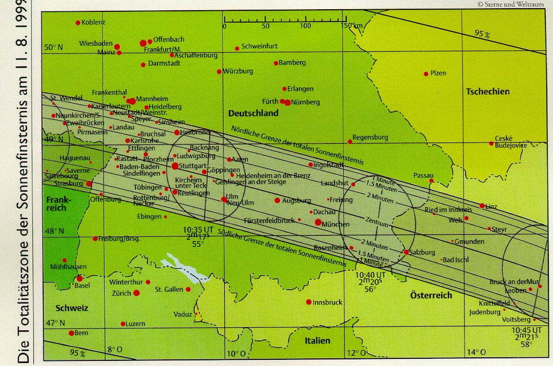 Later hoorden we dat 10 km verder de hemel onbewolkt was op het moment van de verduistering. In Stuttgart daarentegen stonden 200.000 mensen in de gietende regen.