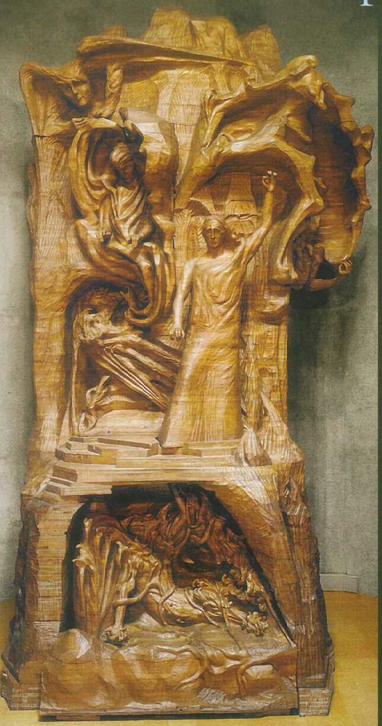 “Daarin hebt u gelijk. Ik trachtte de Christus af te beelden op het ogenblik der verzoeking. Maar goedheid kan in een sculptuur niet weergegeven worden omdat de ogen ontbreken. Daarom heb ik geprobeerd om de uitdrukking van goedheid te leggen in het gebaar van de linkerhand. Als het lukt dan moet het zo worden dat men begrijpt dat Lucifer zich zelf, onder de indruk van deze goedheid, vrijwillig in de diepte stort.”