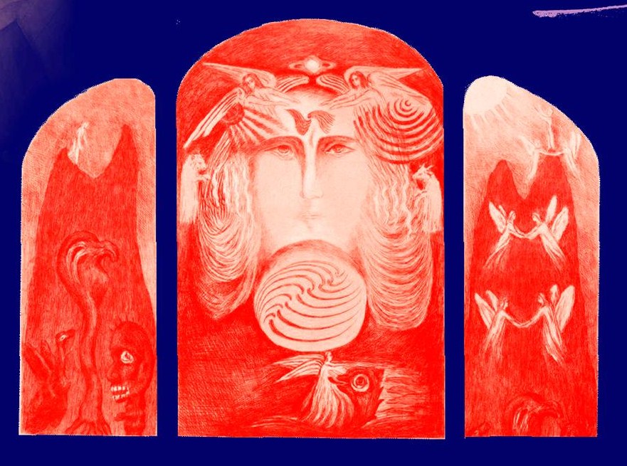 Kijkt men nu naar het rechtervenster, dan schijnt het gevaar geweken te zijn. De mens heeft het dal doorschreden en de tegenoverliggende berg beklommen. Of werd hij door engelwezens omhoog gedragen ? Zij beschermen hem voor de dreiging van de afgrond doordat ze elkaar de handen reiken. De mens zelf heft de handen omhoog en kijkt naar het licht van de zon. De drie vreesaanjagende wezens zinken weg in de afgrond. Ze zijn er nog maar kunnen geen schrik meer inboezemen. De engelen dragen en beschermen de strevende mens. |
