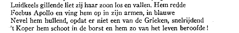 Diomedes geeft niet op, hij gooit zijn lans naar haar en verwondt haar zodat ze Aeneas moet lossen. Gelukkig is daar Apollo :